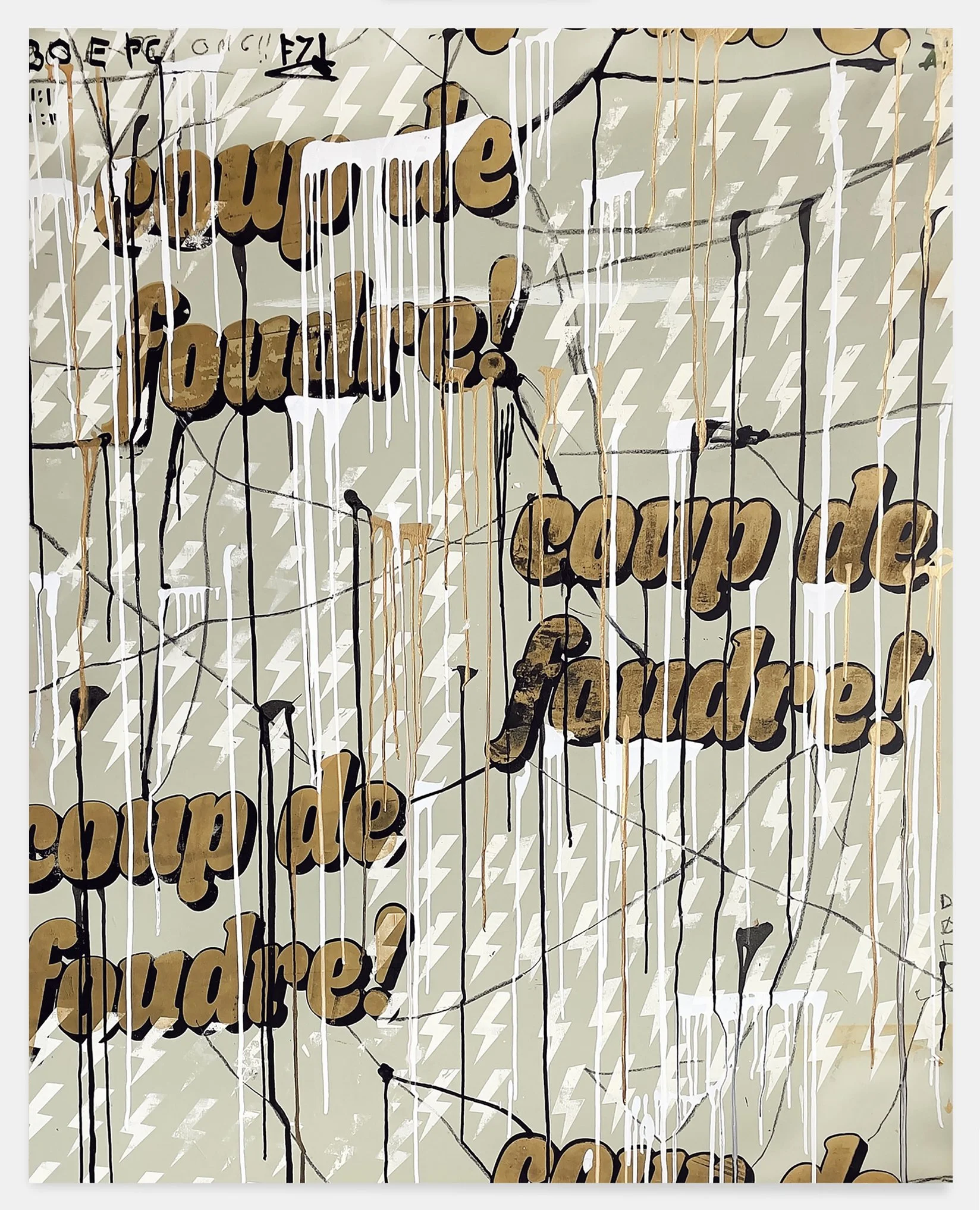 Annabel Linquist’s layered, "graphical charms" reveal deeper dimensions of intention: To conjure and celebrate true love by exploring the ability of the brain to rewire itself with its own thoughts. Linquist's slightly muted fluorescent hues laced with gold and dripped like icing over a dead flat, matte surface arouse the electric emotions of an 80’s dance party — the one where you slow danced for the first time with your crush.